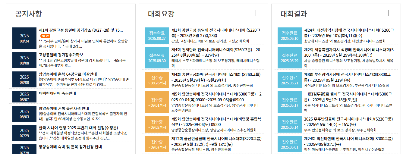 - 대회 일정 달력: 연간 대회 일정을 한눈에 확인 가능